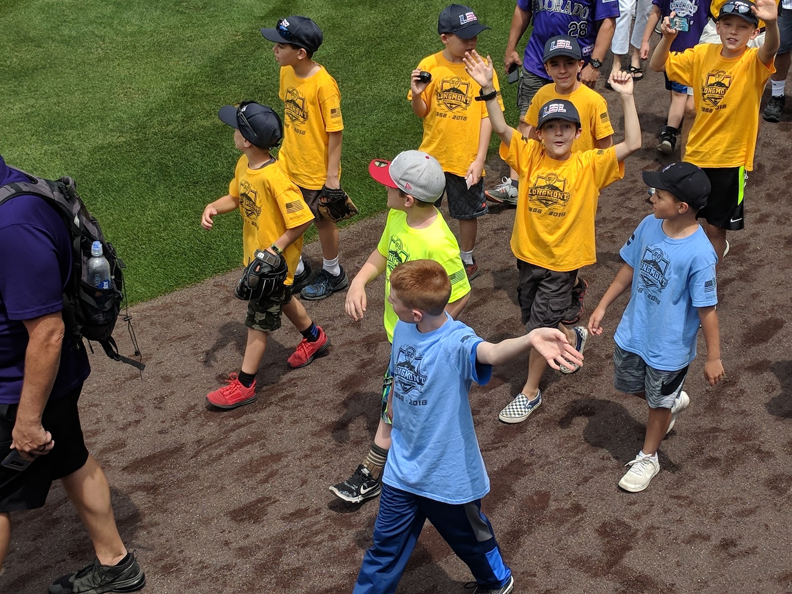 One of the perks of playing baseball with the Longmont Baseball League is being invited to walk the field before a Rockies game at Coors Field. The boys look forward to it every year! This year was no exception. It was a beautiful day - not too blistering hot - and the Rockies were playing the Dodgers, which was supposed to be a good game. The Bayon family and we stopped in Boulder to have breakfast at one of our favorite joints, The Buff, before heading into Denver for the game.